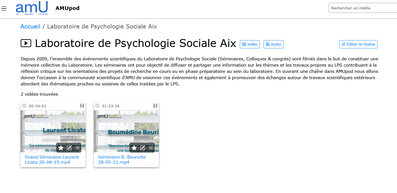 Depuis 2009, l’ensemble des événements scientifiques du Laboratoire de Psychologie Sociale (Séminaires, soutenances de Thèses et HDR, Colloques & congrès) sont filmés dans le but de constituer une mémoire collective du Laboratoire. Vous pouvez regarder les grands séminaires, Colloques & congrès du LPS enregistrés depuis 2009.